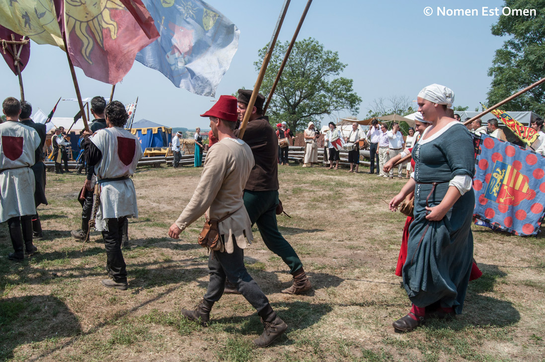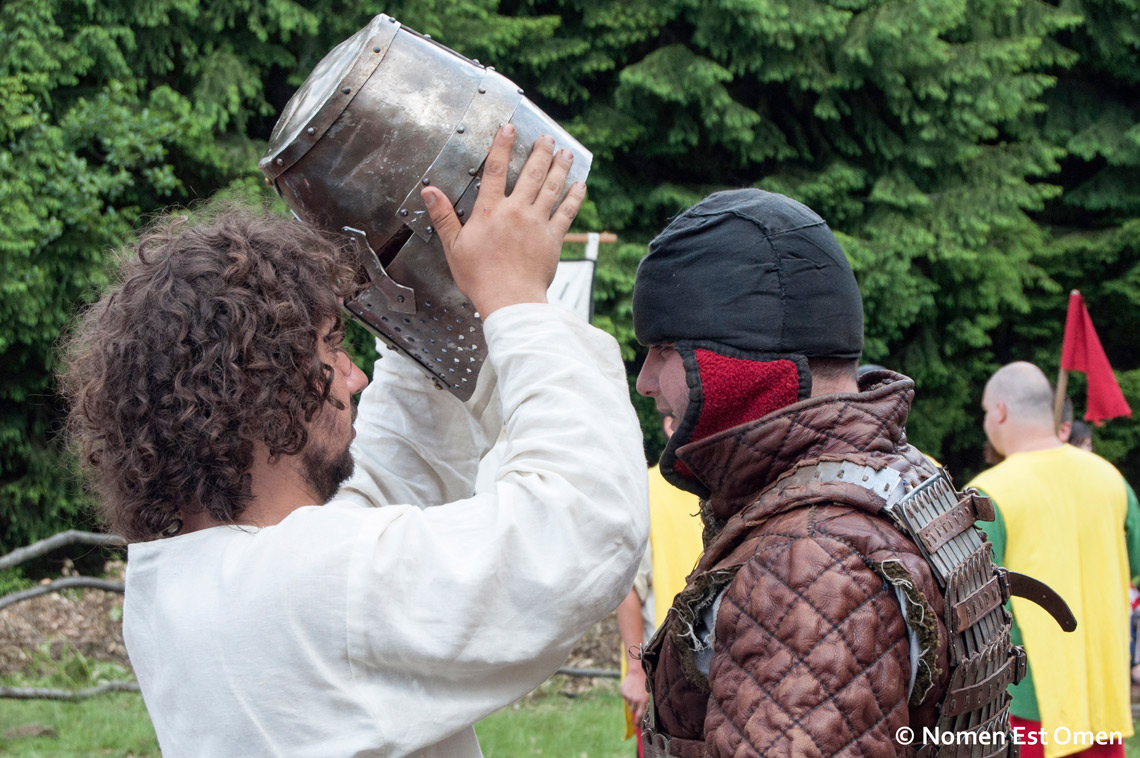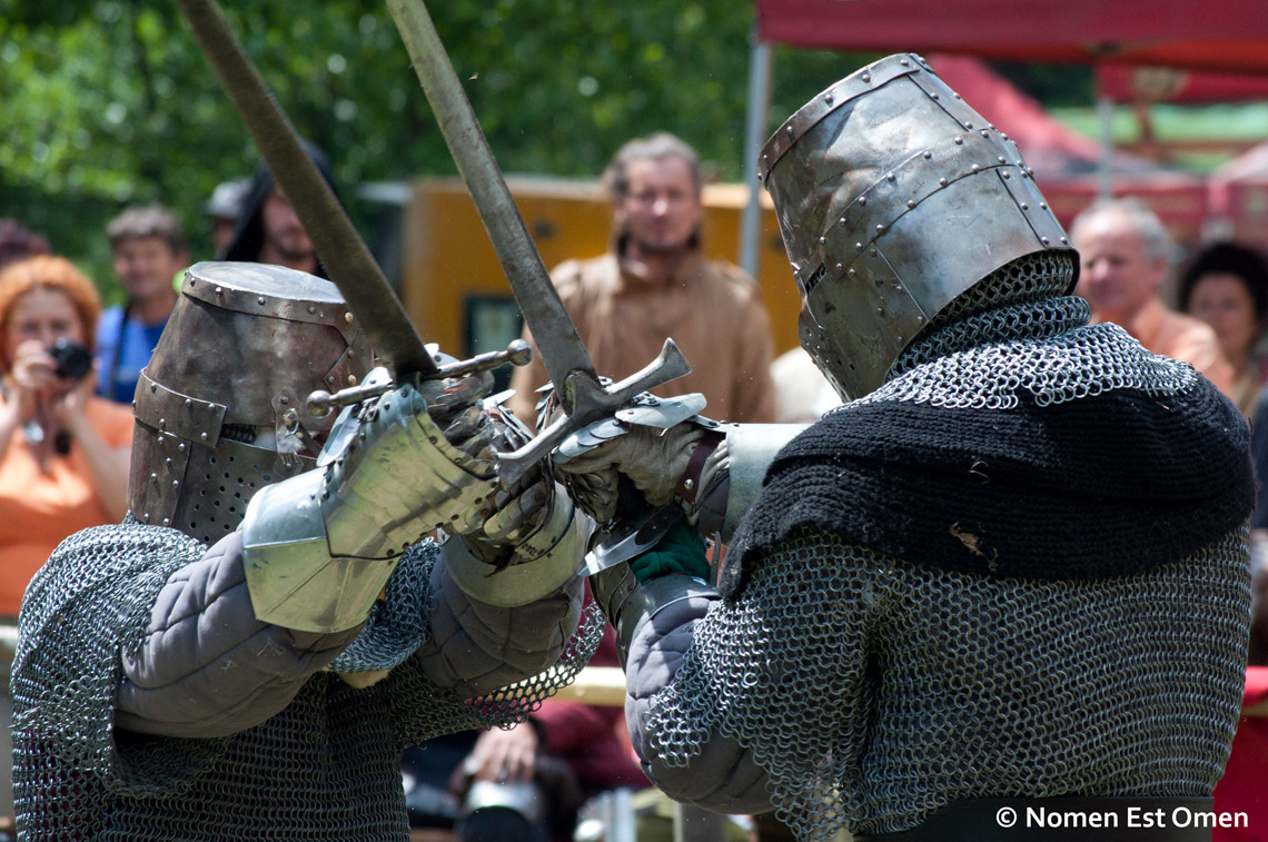 Nomen Est Omen a trecut la sfârşitul lui mai 2013 printr-un sat medieval, aflat lângă Baia Mare, altfel spus un spaţiu inedit (raportat la cele ştiute până în prezentul scrierii acestor rânduri) al manifestărilor reenactment din România. Proiectul, work in progress, presupune construirea infrastructurii corespunzătoare evenimentelor de gen, în cadrul cărora cavalerii şi motocicliştii să îşi poată desfăşura activităţile specifice la cele mai înalte cote, pe întreg parcursul verii. Turnirul, la care au fost prezenţi luptători din trei ordine cavalereşti, a fost organizat pe categorii de arme şi de greutate, în runde, cu arbitri şi preparatori fizici. Armurile şi arsenalul de luptă au concurat cu succes motoarele în cadrul acestui gathering, echipamentul purtat de luptători cântărind în jur de 40 kg.