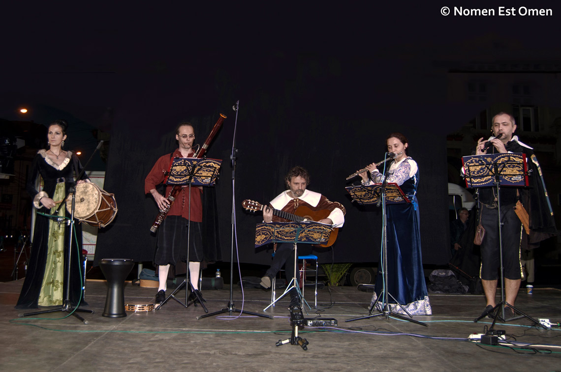 Principalul festivalul al Sighişoarei a purtat de-a lungul vremurilor mai multe denumiri în acte şi pe afişe, toate conţinȃnd cuvȃntul-cheie “medieval”. Sub aceastǎ egidǎ de sorginte postmodernǎ au intrat, alǎturi de muzica medievalǎ, numeroase momente de folk, world, blues, rock şi aşa mai departe. În ideea de a pǎstra spiritul istoric şi de a mulţumi publicul larg care obişnuieşte sǎ onoreze festivalul, organizatorii au cǎutat sǎ plaseze momentele artistice de inspiraţie istoricǎ în cetate şi pe cele paralele în afara zidurilor. Atȃta doar cǎ rotaţia trupelor pe scenele existente, planificatǎ în relaţie cu faptul cǎ, în general vorbind, show-ul trebuie sǎ continue, a însemnat adeseori şi amestecarea genurilor. Astfel, Nomen Est Omen a cȃntat înainte şi dupǎ formaţii sau interpreţi de toate felurile. Repertoriul şi vestimentaţia au fost adaptate, de la caz la caz, în funcţie de cerinţele momentelor. Poza cu Laurenţiu, Cristina, Mihai, Claudiu şi Adrian, recent gǎsitǎ în arhive, a fost capturatǎ în Piaţa Sigma, cel mai probabil în 2003.