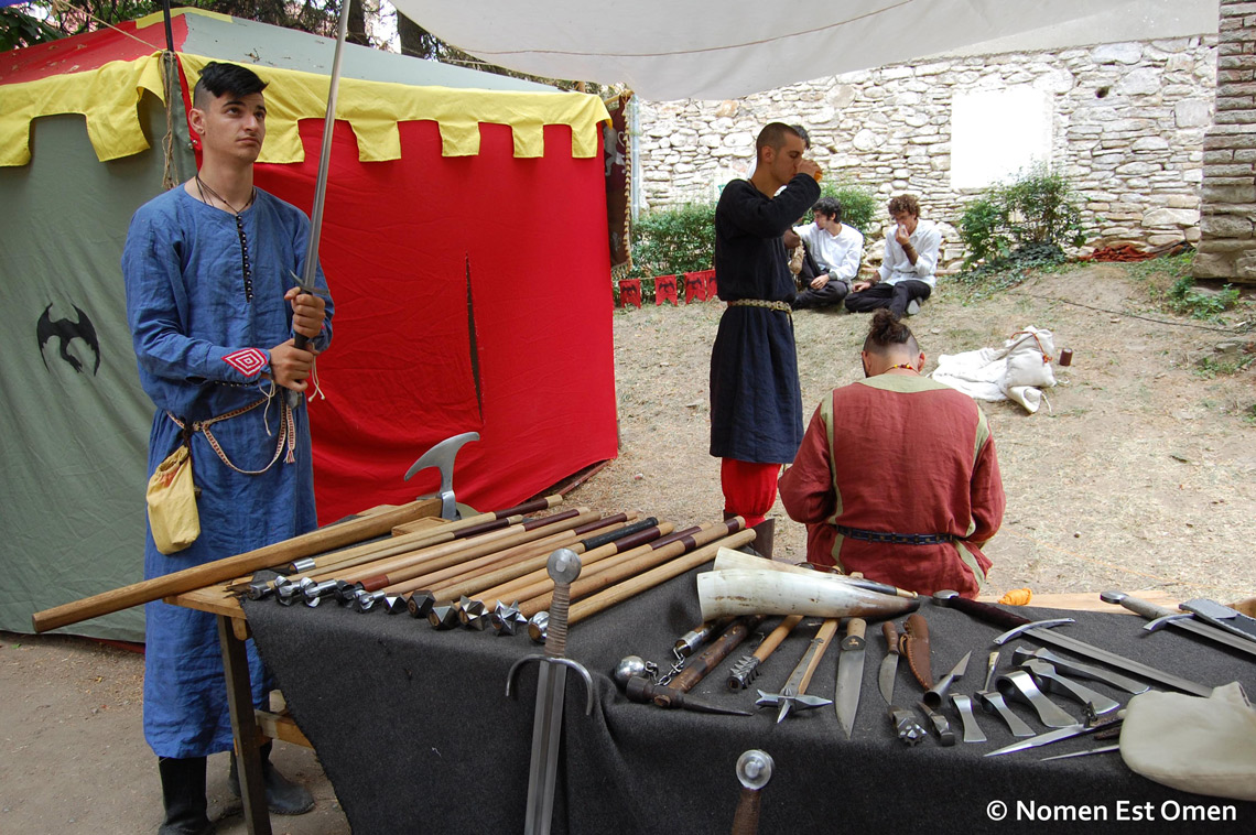 Se spune că cine ridică sabia, de sabie va muri. Desigur sensul este figurat; nu ne facem nici o problemă în privinţa faptului că cititorul a conştientizat din primul moment gluma noastră, respectiv că a luat în consideraţie jocul ludic prin care propunem o interpretare ad literam a proverbului. Ce ne interesează în rîndurile de faţă sunt săbiile, adevărate bijuterii ale scrimei artizanale, în care nimeni nu este şi nu trebuie să fie rănit. Alături de acestea, multe – multe alte arme şi-au avut şi îşi au oamenii curajoşi şi îndemânatici care să le mânuiască. Chiar dacă “armele” Nomen Est Omen sunt blockflote-ul, chitara, flautul, vioara, percuţia şi vocea, o fotografie cu arme şi cavaleri în exerciţiul funcţiunii, realizată cu ocazia vreunui festival, este întotdeauna binevenită în albumul formaţiei.