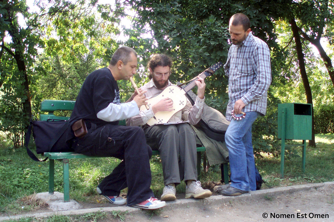 Festivalul Cetăţi Transilvane din Sibiu este un reper al mişcării pe care o vom numi, în contextul dat, medievale, din România. De-a lungul timpului, al celor XIII ediţii desfăşurate până în momentul rândurilor de faţă, festivalul a fost o adevărată platformă pentru numeroase formaţii, grupuri şi echipe artistice, una dintre acestea fiind Nomen Est Omen. O poză din 2003 îi înfăţişează pe Cristian Lazăr, Gabriel Bălaşa, Adrian Nastac, Doina Stan, Adam Siminiceanu şi Mihai Plămădeală, în curtea Bisericii Evanghelice. Zece ani mai târziu, în 2013, respectiva fotografie a ieşit parcă singură la iveală, în timpul reorganizării arhivei, de fapt a mutării sale în alt spaţiu. Pentru a intra pe tărâmul unor raţionamente profunde, afirmăm, evident în glumă, că trecerea timpului nu poate fi oprită, dar poate fi marcată.